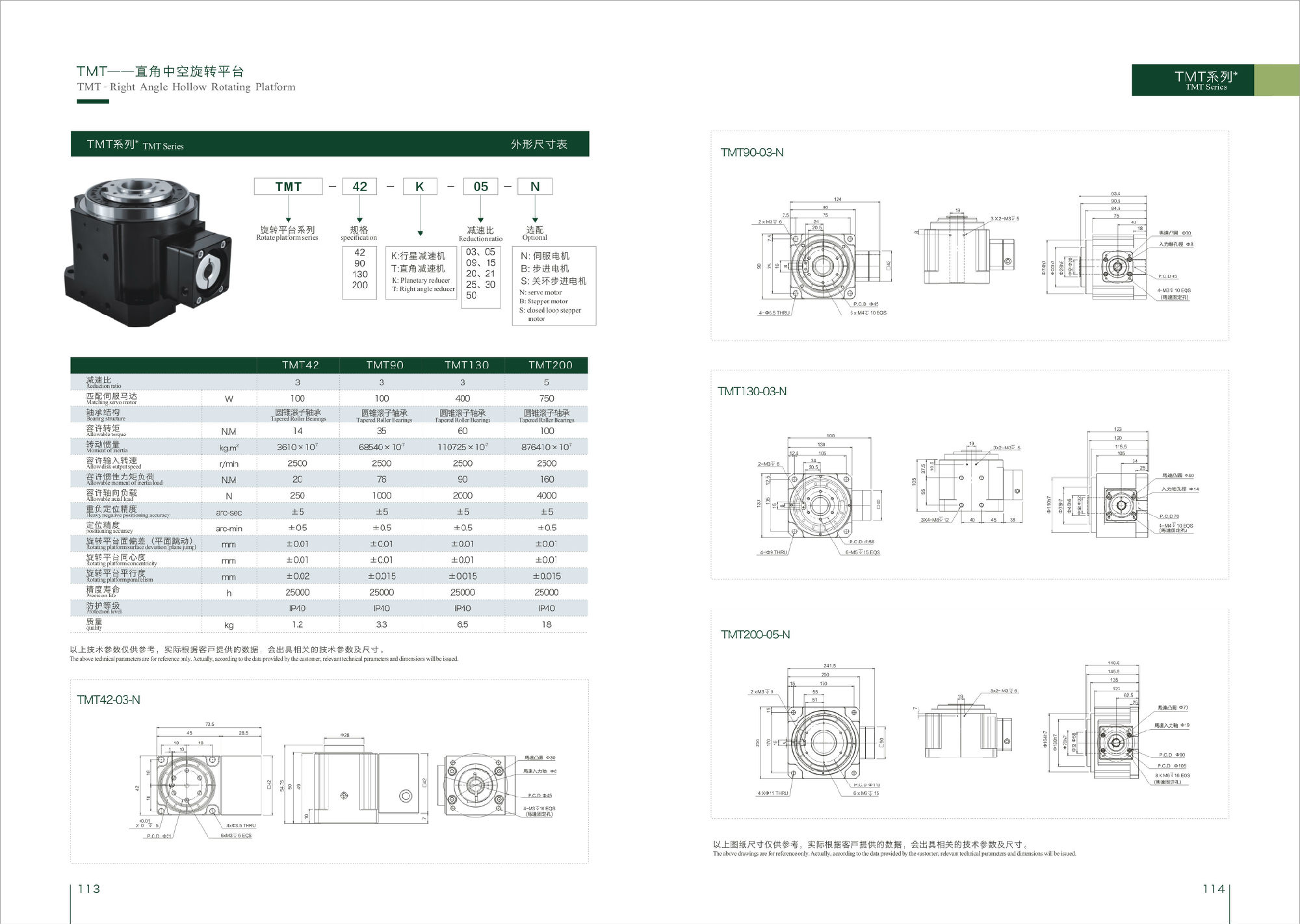 TMT中空旋轉平臺傳動齒輪經(jīng)過研磨處理,使用高精度齒輪結構和徑向軸承,方便設計,可任意搭配大部分品牌的伺服馬達。