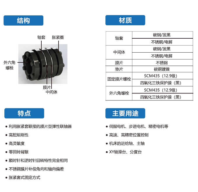 HSFPS-T系列聯(lián)軸器采用碳鋼發(fā)黑,利用脹緊套聯(lián)接的膜片型彈性聯(lián)軸器,廣泛用于伺服電機、步進電機、精密電機等。