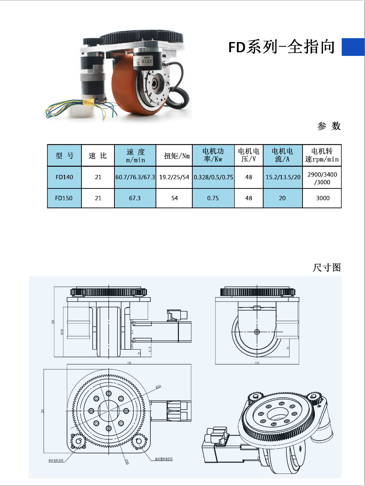 FD系列舵輪組,全指向型。采用差速驅(qū)動(dòng)輪組模塊,將減速機(jī)與驅(qū)動(dòng)輪設(shè)計(jì)為一體,加外接直流電機(jī),成為高度集成的機(jī)電一體化AGV行走驅(qū)動(dòng)輪組組件。其結(jié)構(gòu)簡(jiǎn)單,性能可靠,便于安裝。