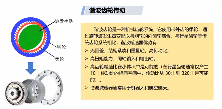 諧波減速機(jī),其通過(guò)具有柔性的薄壁外齒齒輪產(chǎn)生彈性變形后與剛性的內(nèi)齒輪進(jìn)行內(nèi)嚙合來(lái)實(shí)現(xiàn)傳動(dòng)的。它由剛輪、柔輪,波發(fā)生器三大傳動(dòng)元件組成。諧波減速機(jī)傳動(dòng)比大,無(wú)回差,結(jié)構(gòu)緊湊和重量輕,高精度等優(yōu)點(diǎn)在機(jī)器人及自動(dòng)化技術(shù)領(lǐng)域發(fā)揮舉足輕重的作用,我國(guó)自1980年開始進(jìn)行諧波減速器標(biāo)準(zhǔn)化和系列化;1985年制定了中小功率通用諧波減速器系列標(biāo)準(zhǔn),成為世界第四個(gè)擁有通用諧波減速標(biāo)準(zhǔn)的國(guó)家。