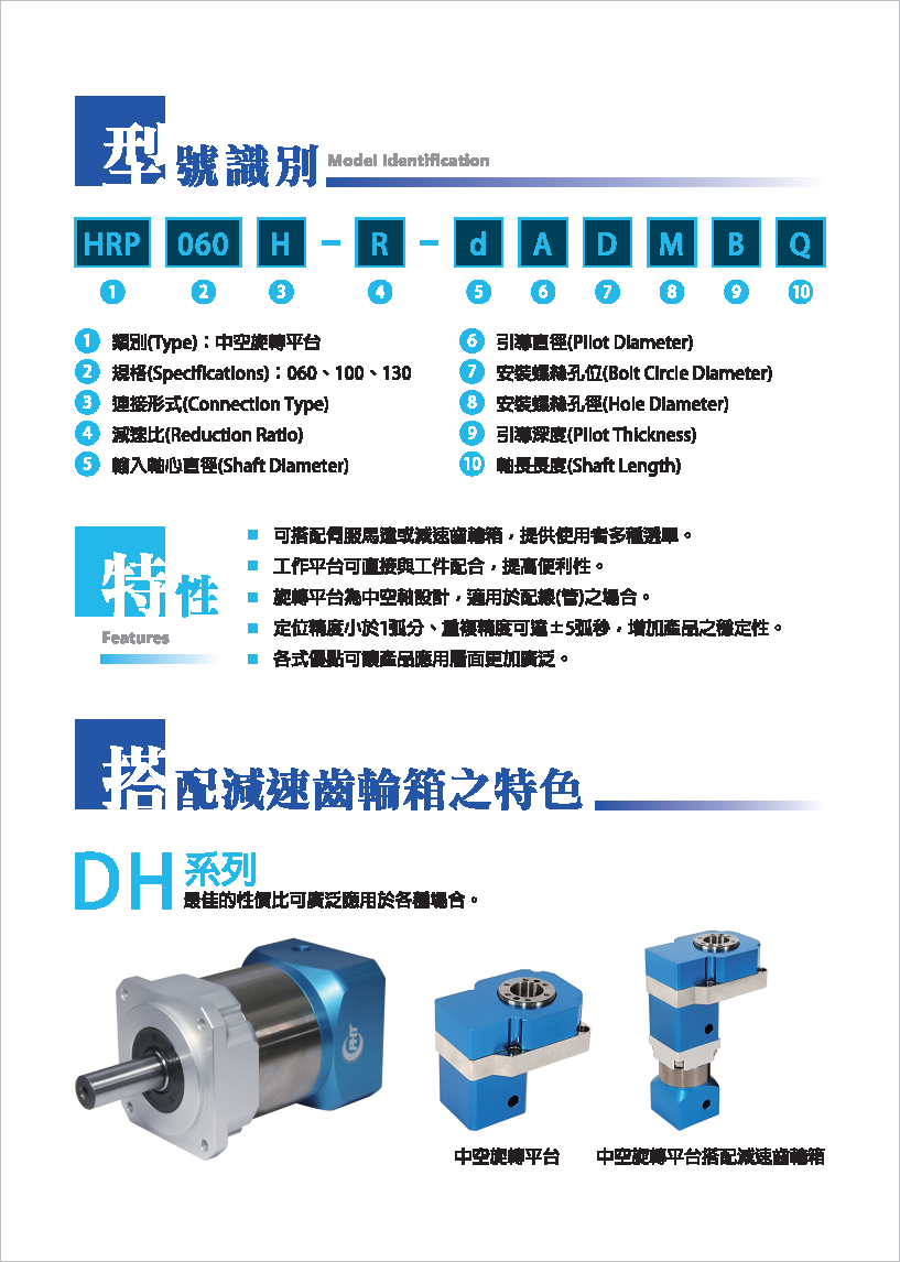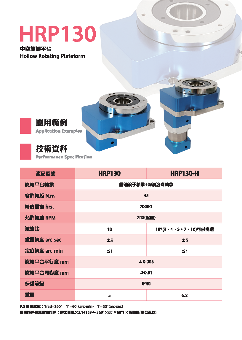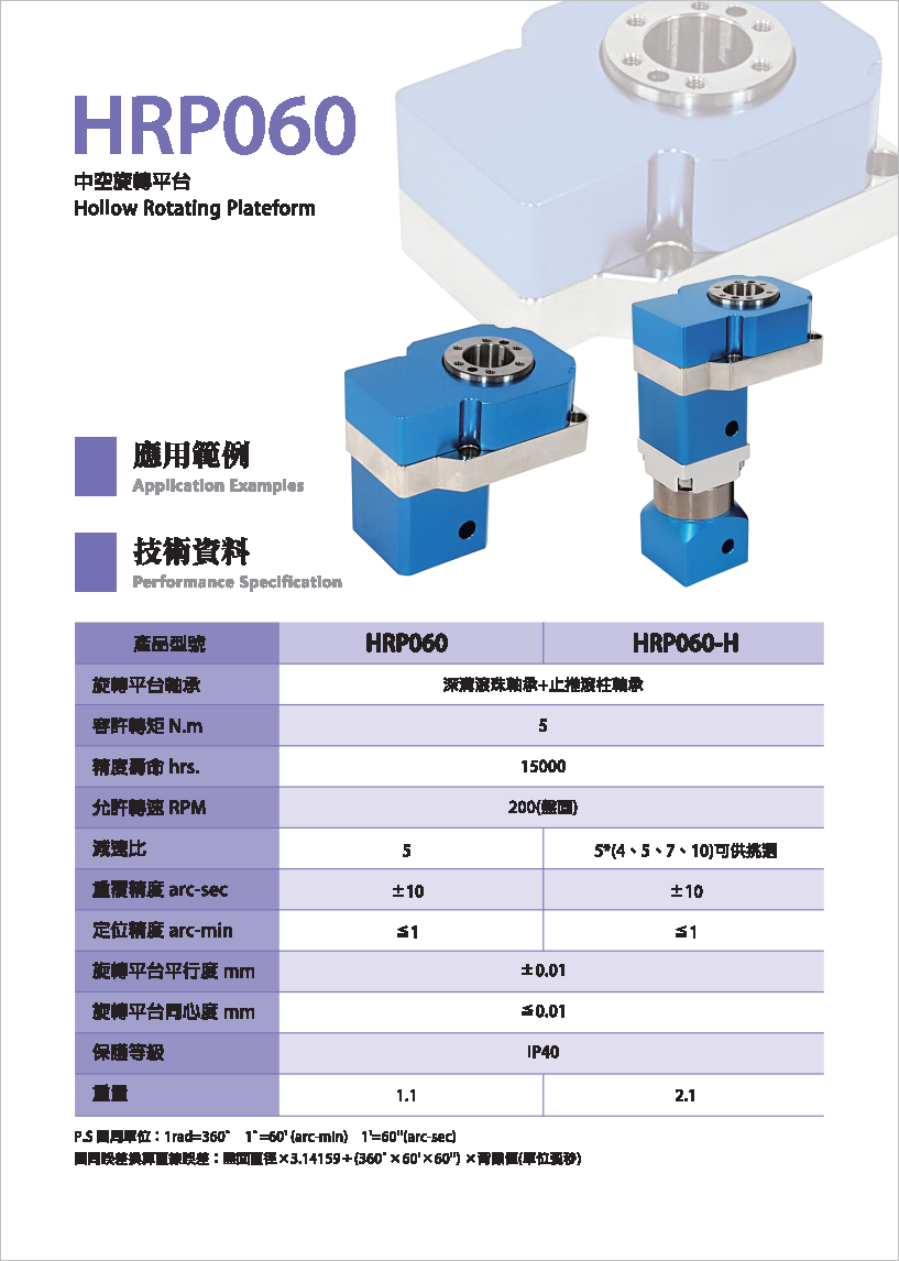 HRP系列是品宏轉角減速機系列。 可搭配伺服馬達或減速齒輪箱,提供使用者多種選擇。 工作平臺可直接與工件配合,提高便利性。 旋轉平臺為中空軸設計,適用于配管之場合。 定位精度小于1弧分,重復精度可達±5弧秒,增加產品之穩(wěn)定性。 各式優(yōu)點可讓產品應用層面更加廣泛。